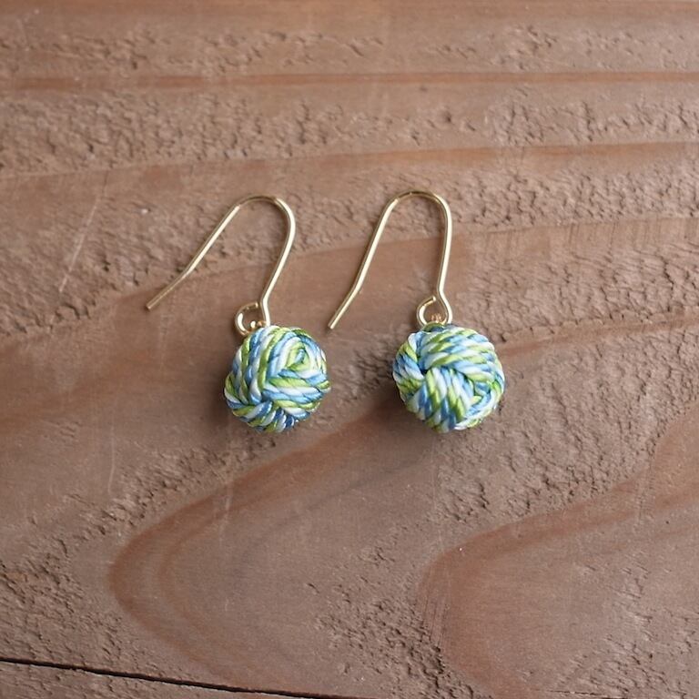 京都西陣で鮮やかに染め上げられた3本の糸の束でできた組紐をまるくまるく結んで作ったちいさなこぶし結びのピアスです。柔らかな質感ときれいな光沢のある発色です。軽い付け心地で普段使いはもちろん、浴衣や着物など和装でもお愉しみいただけます。