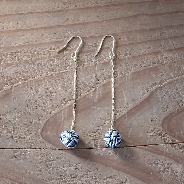 京都西陣で鮮やかに染め上げられた3本の糸の束でできた組紐をまるくまるく結んでこぶし結びのピアスです。柔らかな質感ときれいな光沢のある発色のシルクの玉がゆらゆら揺れるロングタイプ。
